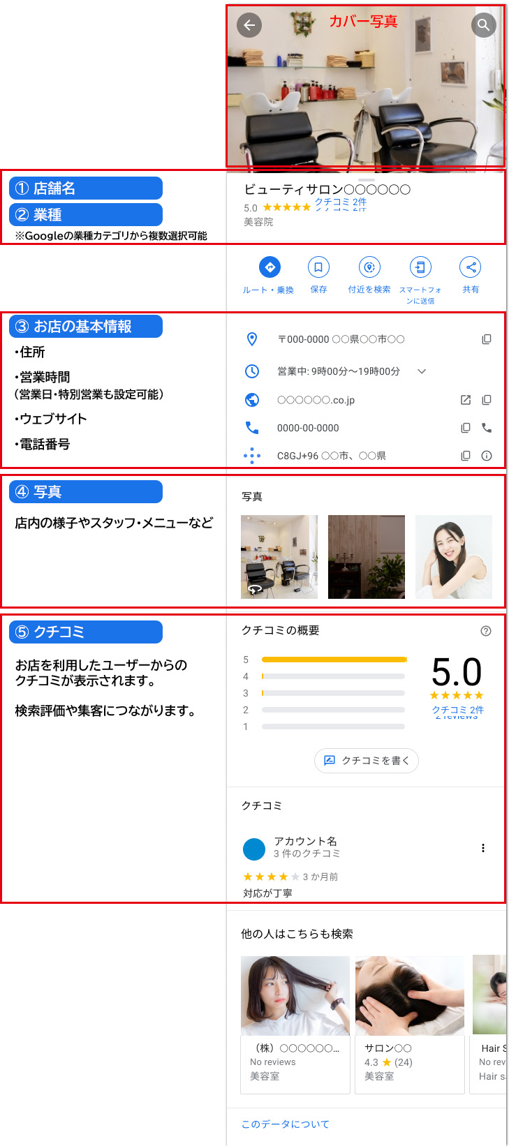 例(美容室:①施術内容、②カット&カラー、③7980円、④施術説明)